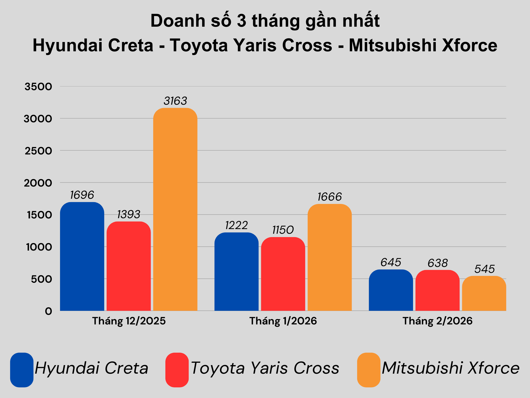 Theo báo cáo từ Hiệp hội Các nhà sản xuất ô tô Việt Nam (VAMA) và TC Motor, kỳ nghỉ Tết Nguyên đán kéo dài đã kìm hãm sức bán của hầu hết các sản phẩm ô tô trong tháng 2/2026. Mitsubishi Xforce, Hyundai Creta và Toyota Yaris Cross cũng không đứng ngoài xu hướng, với số liệu bán hàng giảm khoảng 45-65% so với tháng trước.