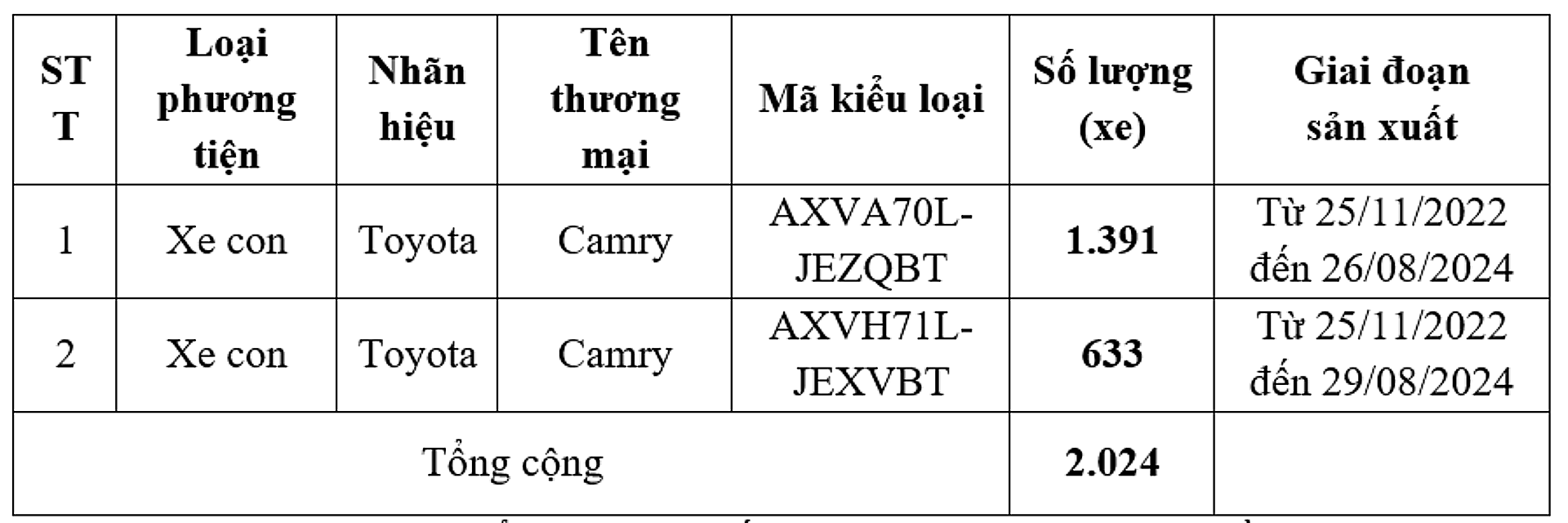 Triệu hồi hơn 2.000 xe Toyota Camry 2022-2024 tại Việt Nam do lỗi sản xuất
